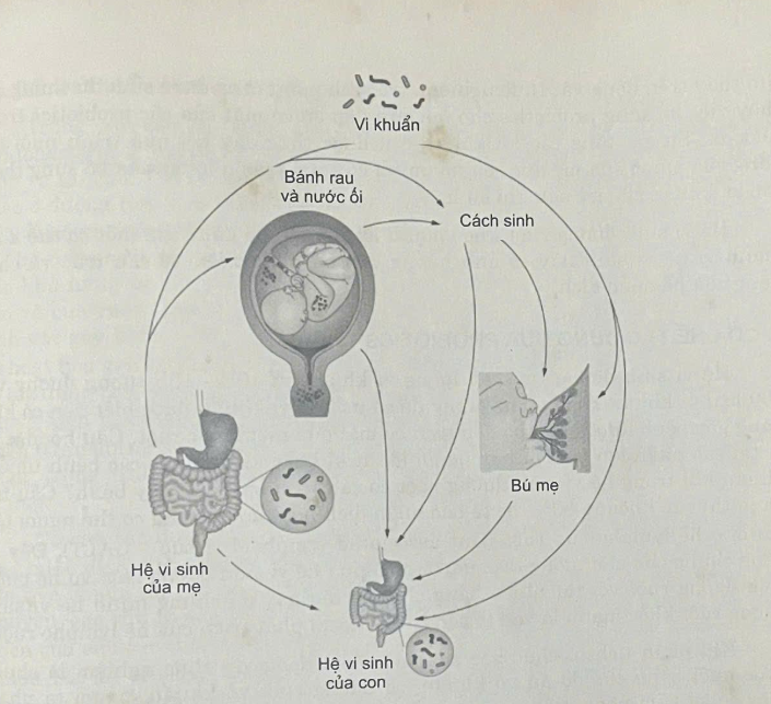 Lúc mới sinh ra, cơ thể trẻ hoàn toàn vô khuẩn. Nhưng trong quá trình sinh tự nhiên qua đường âm đạo, trẻ được nhận các vi khuẩn từ âm đạo và hệ vi sinh trong đường ruột của người mẹ. Chủ yếu là Bacteroides, Lactobacillus và Bifidobacterium. Từ những vi khuẩn ban đầu này, hệ vi sinh đường ruột ở trẻ em bắt đầu thiết lập.