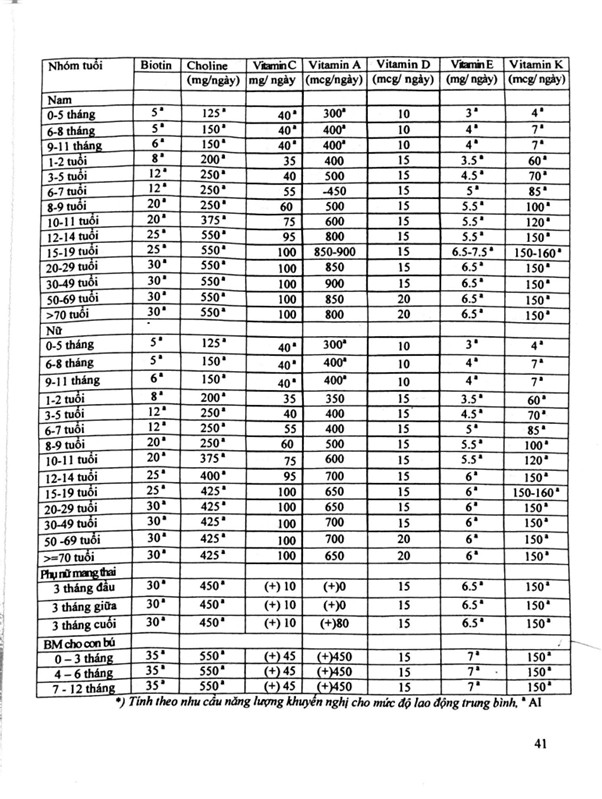 Nhu cầu vitamin A được tính bằng mcg hoặc bằng đơn vị quốc tế (UI). Mỗi UI bằng 0,3 microgam retinol, cũng có thể quy đổi nhu cầu retinol ra nhu cầu caroten. Nhu cầu vitamin A cho người Việt Nam: xin xem bảng phụ lục ở cuối bài này.