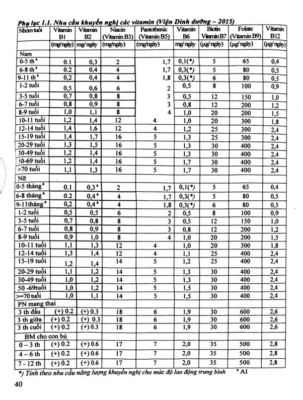Theo FAO/WHO, nhu cầu vitamin B1 cho mọi lứa tuổi và đối tượng lao động là 0,4mg/1.000 Kcalo.